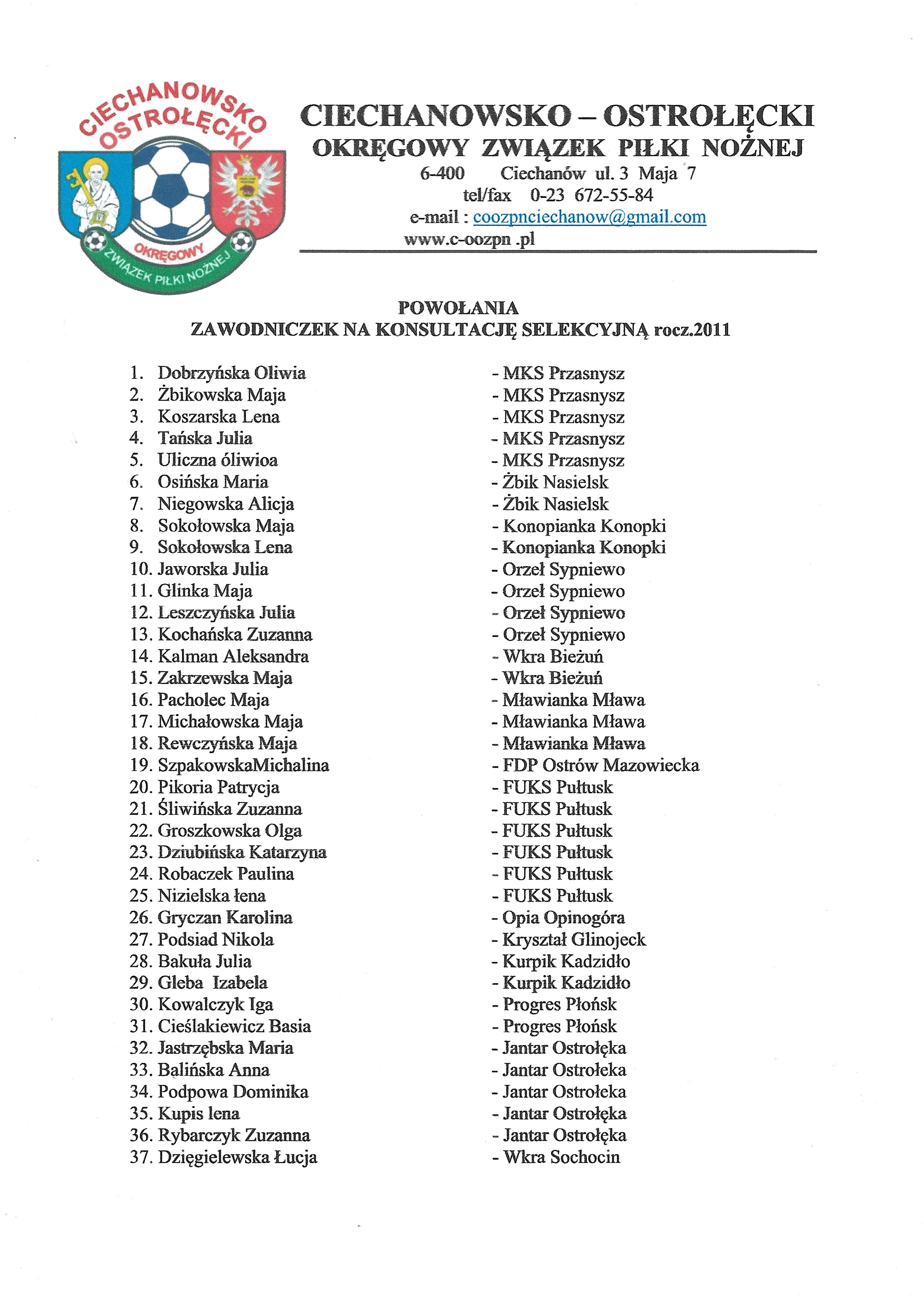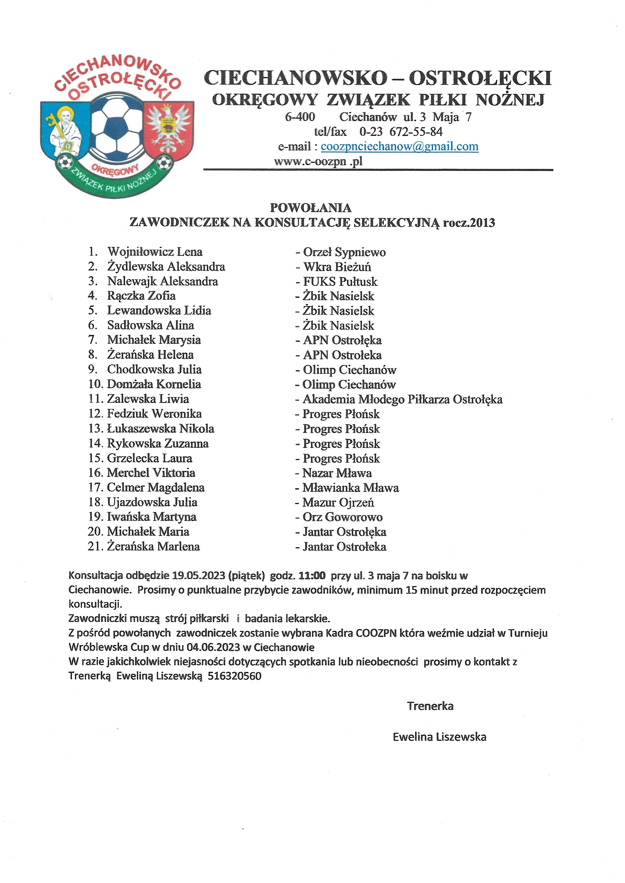 Sześć naszych zawodniczek z „AS Progres Ladies” otrzymało powołanie na konsultację selekcyjną dziewczynek organizowaną przez COOZPN, która odbędzie się 19.05.2023 r. przy ul. 3 maja 7 (stadion MOSiR) w Ciechanowie.