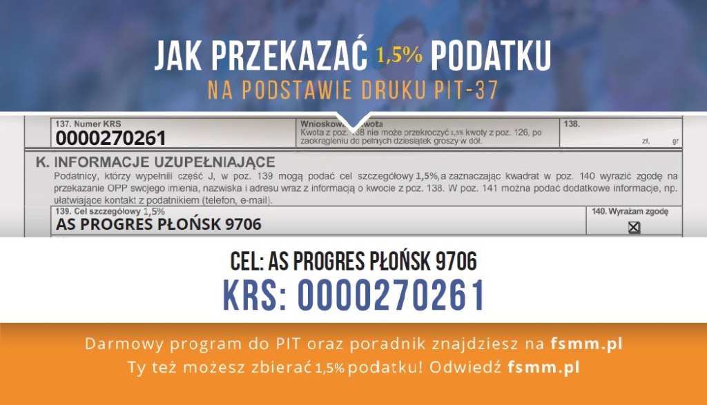 Zachęcamy kibiców i rodziców do przekazania 1,5% podatku na rzecz AS Progres Płońsk. Wszystkie otrzymane środki zostaną wykorzystane na realizację naszych celów statutowych m.in. zakup sprzętu treningowego, organizację zajęć oraz udział w rywalizacji sportowej.
