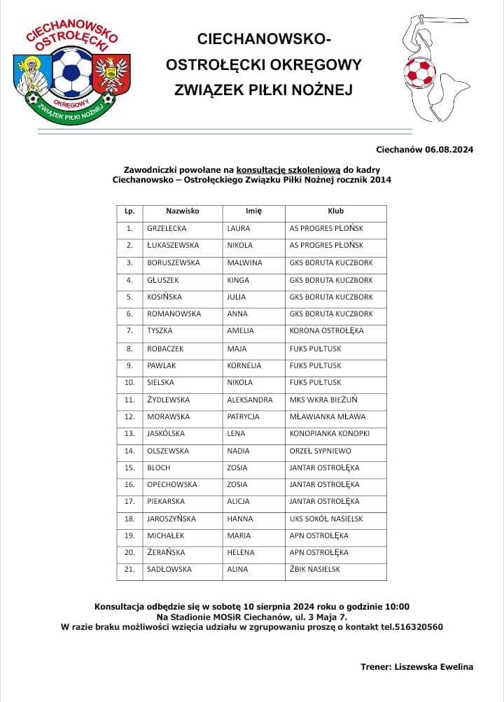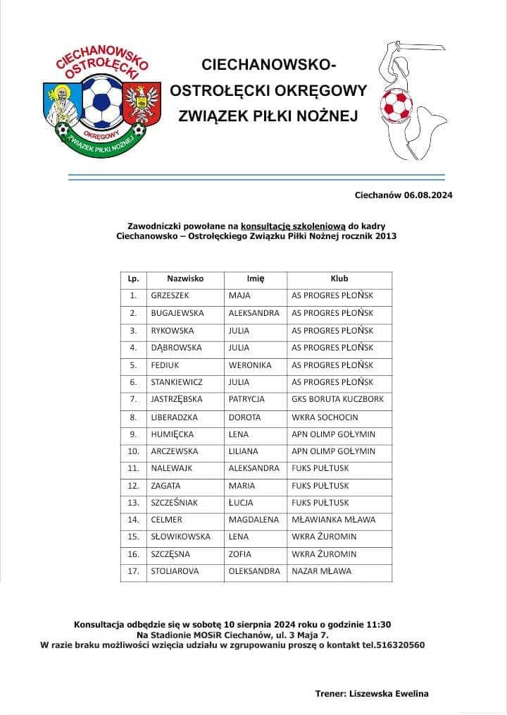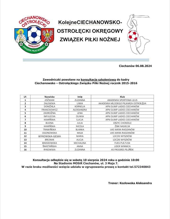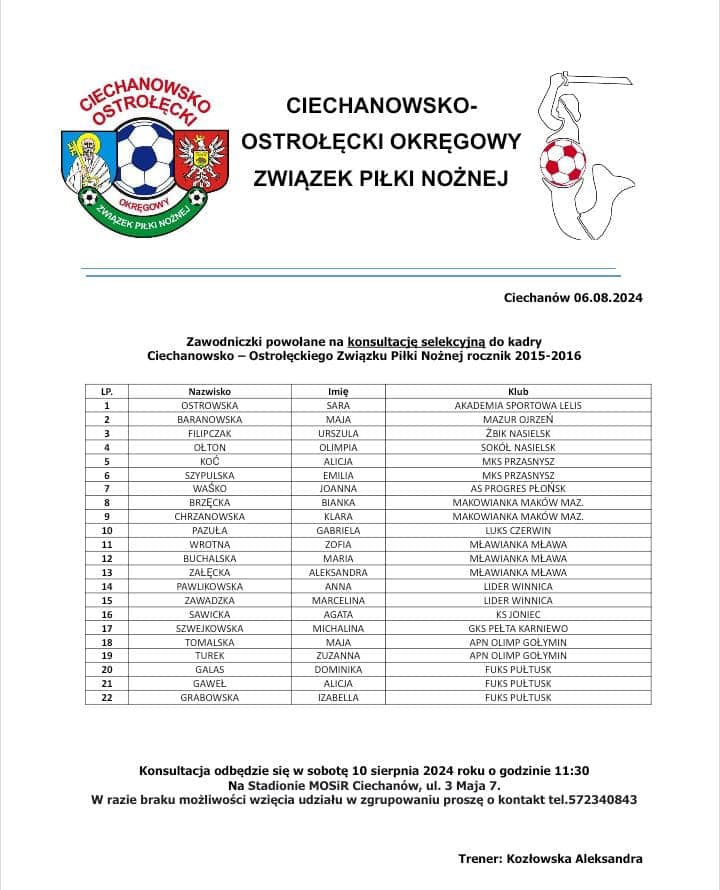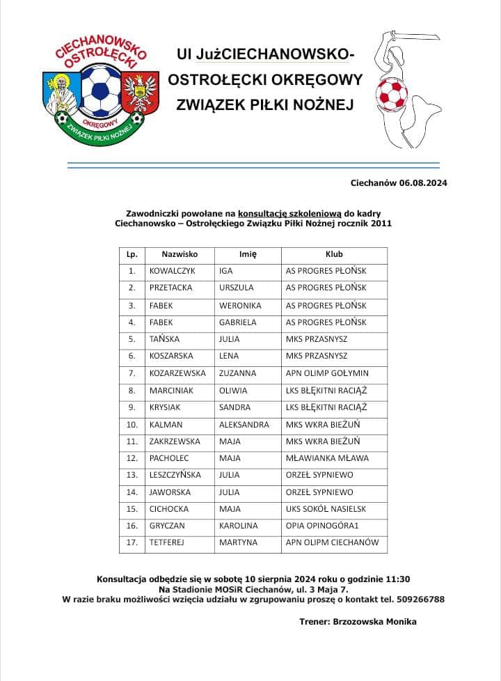 W najbliższą sobotę, 10 sierpnia na stadionie MOSiR w Ciechanowie, odbędzie się konsultacja szkoleniowa dziewcząt z roczników 2011-2016 do kadr COOZPN. Z naszego klubu powołania otrzymało łącznie 18 zawodniczek. Brawo dla naszych dziewcząt i życzymy powodzenia! Poniżej lista powołanych piłkarek.