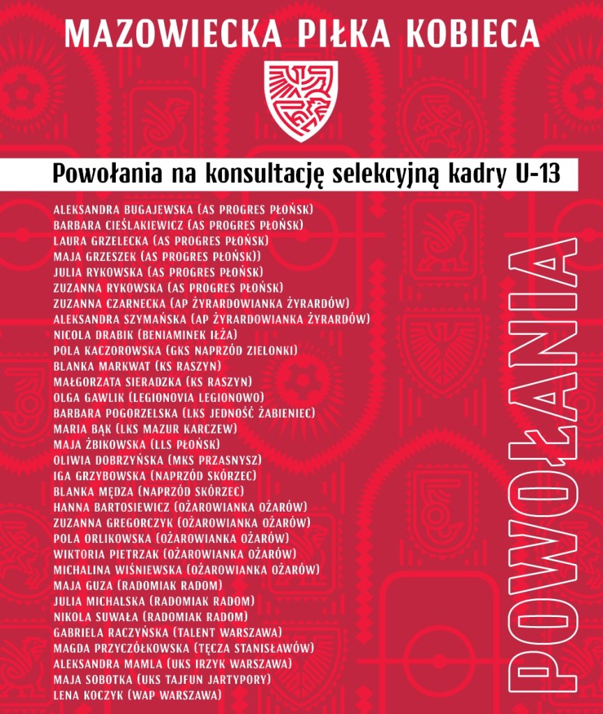 Sześć zawodniczek Progresu: Aleksandra Bugajewska, Basia Cieślakiewicz, Maja Grzeszek, Julia Rykowska, Laura Grzelecka i Zuzia Rykowska, otrzymało powołania na konsultację selekcyjną kadry U-13 Mazowieckiego Związku Piłki Nożnej, która odbędzie się 09 października w Warszawie przy Łazienkowskiej 3. Gratulujemy zawodniczkom i trzymamy mocno kciuki. Brawo!