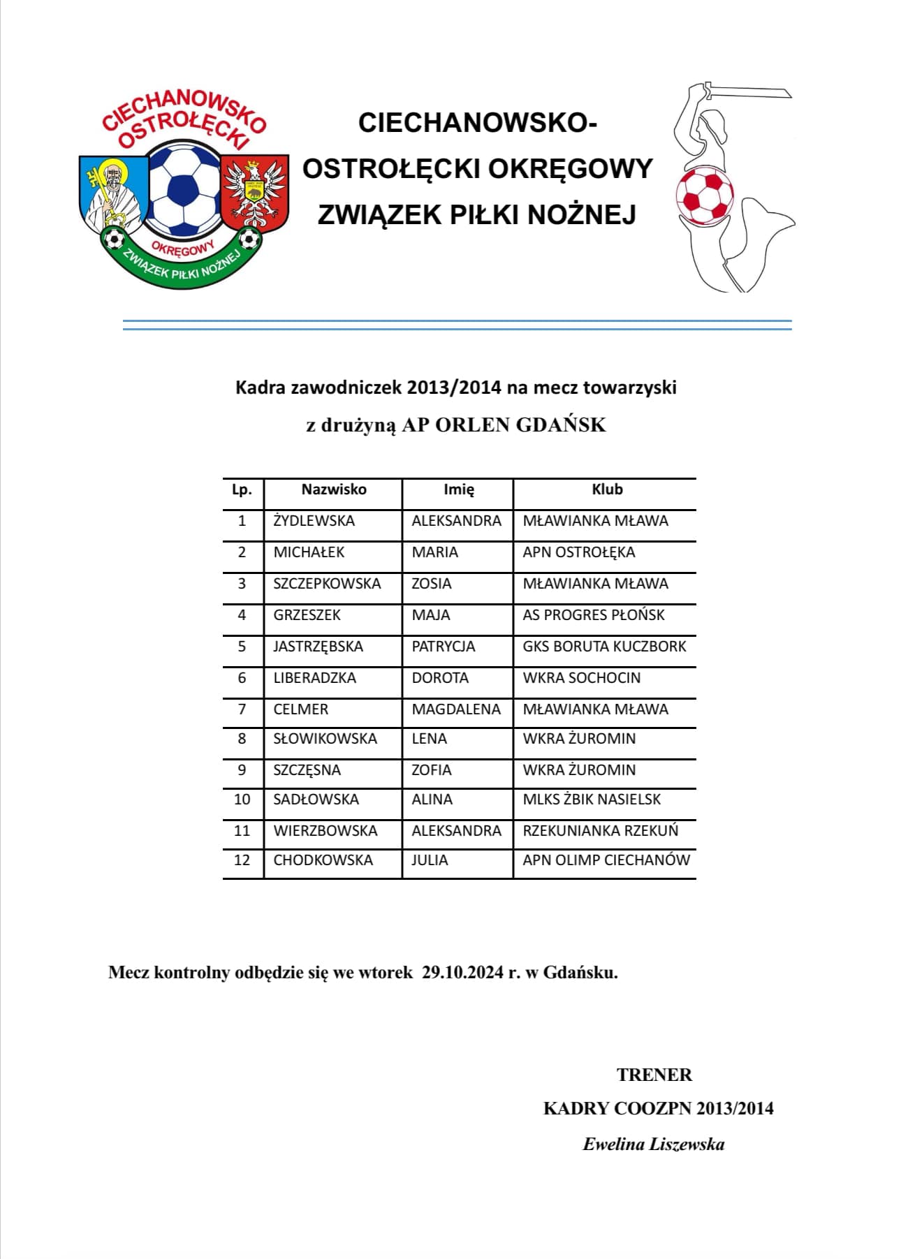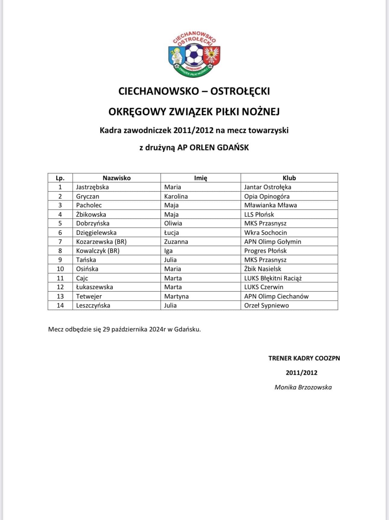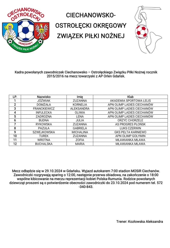 Trzy nasze zawodniczki: Zuzia Rykowska, Maja Grzeszek i Iga Kowalczyk otrzymały powołania do kadry COOZPN dziewcząt z roczników 2011/2012, 2013/2014 i 2015/2016. Dziewczynki rozegrają mecze kontrolne z drużyną AP Orlen Gdańsk i obejrzą mecz Reprezentacji Polski Kobiet z Rumunią. Brawo!