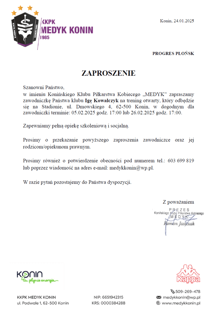 Nasza utalentowana bramkarka Iga Kowalczyk otrzymała ponowne zaproszenie na trening otwarty z KKPK Medyk Konin. Poprzednio nasza zawodnicza na testach w klubie z Konina była w sierpniu. Brawo Iga! To czwarta piłkarka Progresu, która w najbliższym czasie pojawi się na zajęciach w „Medyku”.