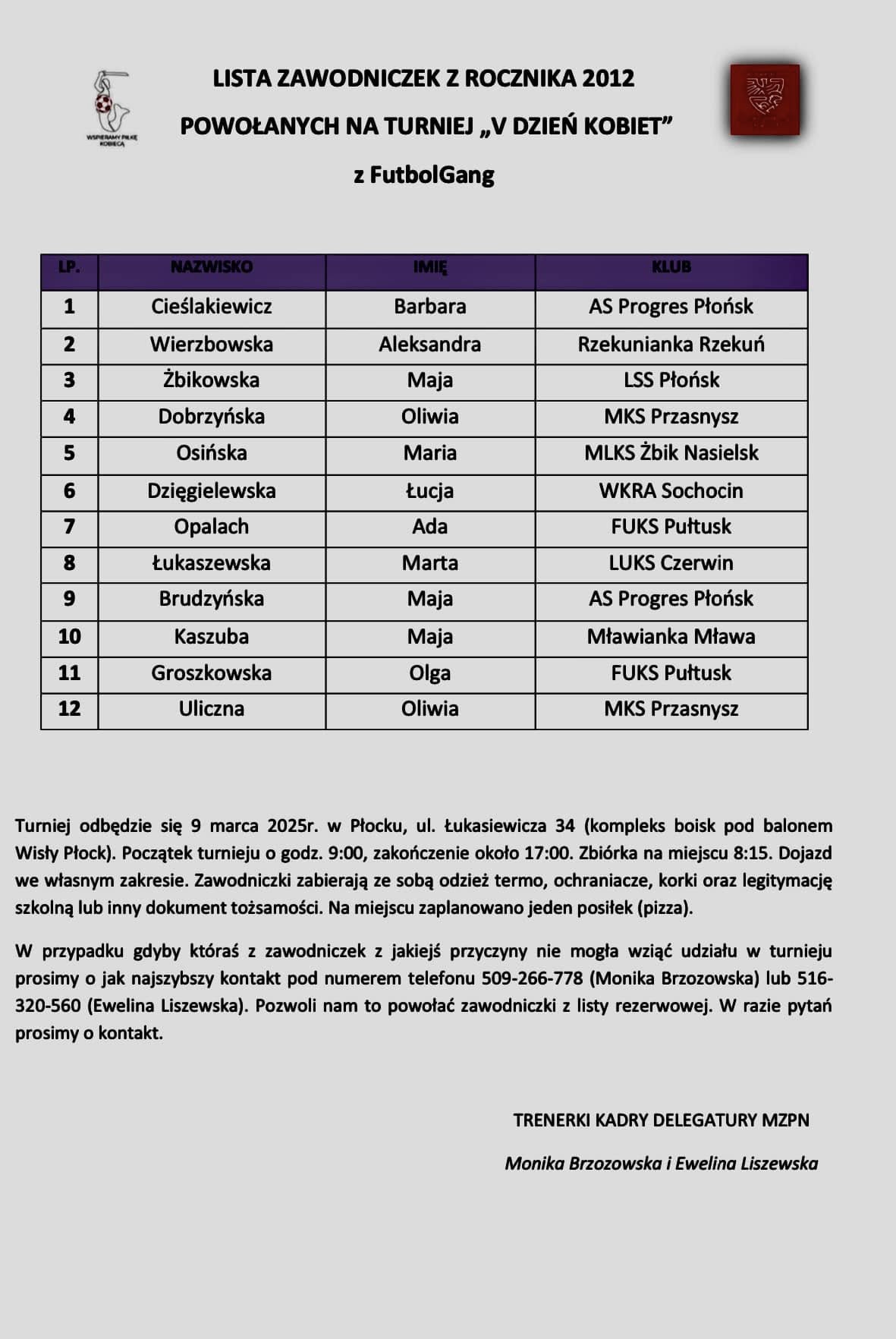 Basia Cieślakiewicz i Maja Brudzyńska zostały powołane do kadry Delegatury MZPN Ciechanów-Ostrołęka, na turniej w Płocku organizowany z okazji Dnia Kobiet. To kolejna, świetna okazja do sprawdzenia swoich umiejętności na tle uznany, kobiecy klubów piłkarskich. Brawo!