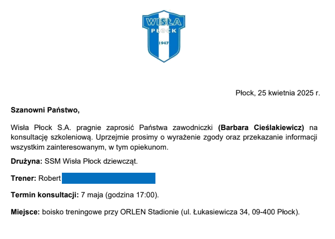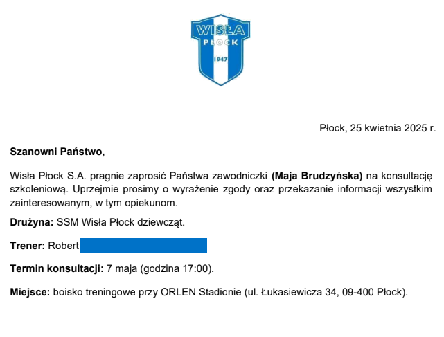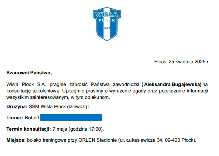 Trzy zawodniczki AS Progres Płońsk: Aleksandra Bugajewska, Basia Cieślakiewicz i Maja Brudzyńska, otrzymały zaproszenie na konsultację szkoleniową z klubu Wisła Płock. Gratulujemy naszym dziewczynkom i życzymy powodzenia. To świetna motywacja dla zawodniczek, ale również i trenerów pracujących z naszymi podopiecznymi. Brawo!
