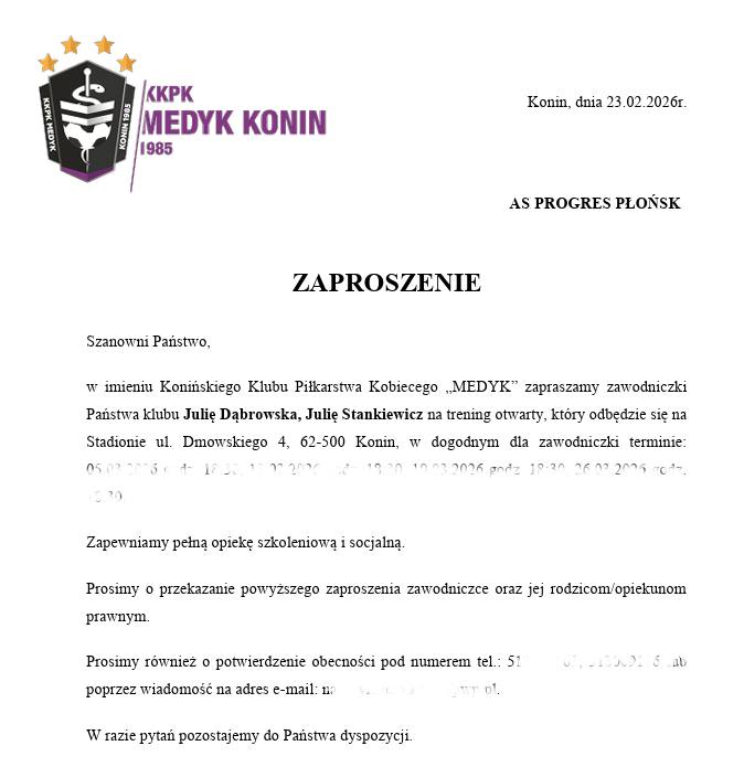 Miła informacja. Dwie nasze wychowanki: Julia Dąbrowska i Julia Stankiewicz, otrzymały zaproszenie na trening testowy z KKPK Medyk Konin. Będzie to druga wizyta naszych zawodniczek w tym uznanym klubie kobiecej piłki nożnej. Gratulacje i życzymy powodzenia.