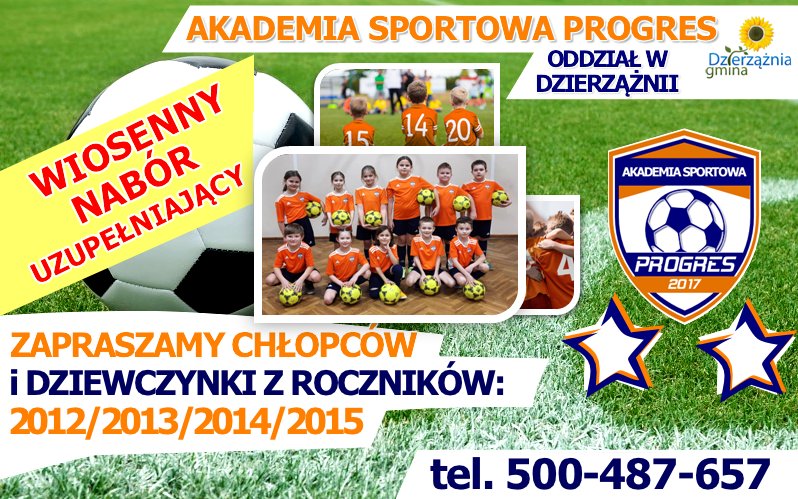 Zapraszamy chłopców i dziewczynki na treningi piłki nożnej do AS Progres – Oddział Dzierzążnia. Zacznij już dziś swoją przygodę z piłką nożną. Gwarantujemy fajną atmosferę, udział w rozgrywkach ligowych i turniejach piłkarskich. DOŁĄCZ DO NAS! tel. 500-487-657kontakt.asprogres@gmail.com Czytaj dalej WIOSENNY NABÓR UZUPEŁNIAJĄCY – ODDZIAŁ W DZIERZĄŻNI!